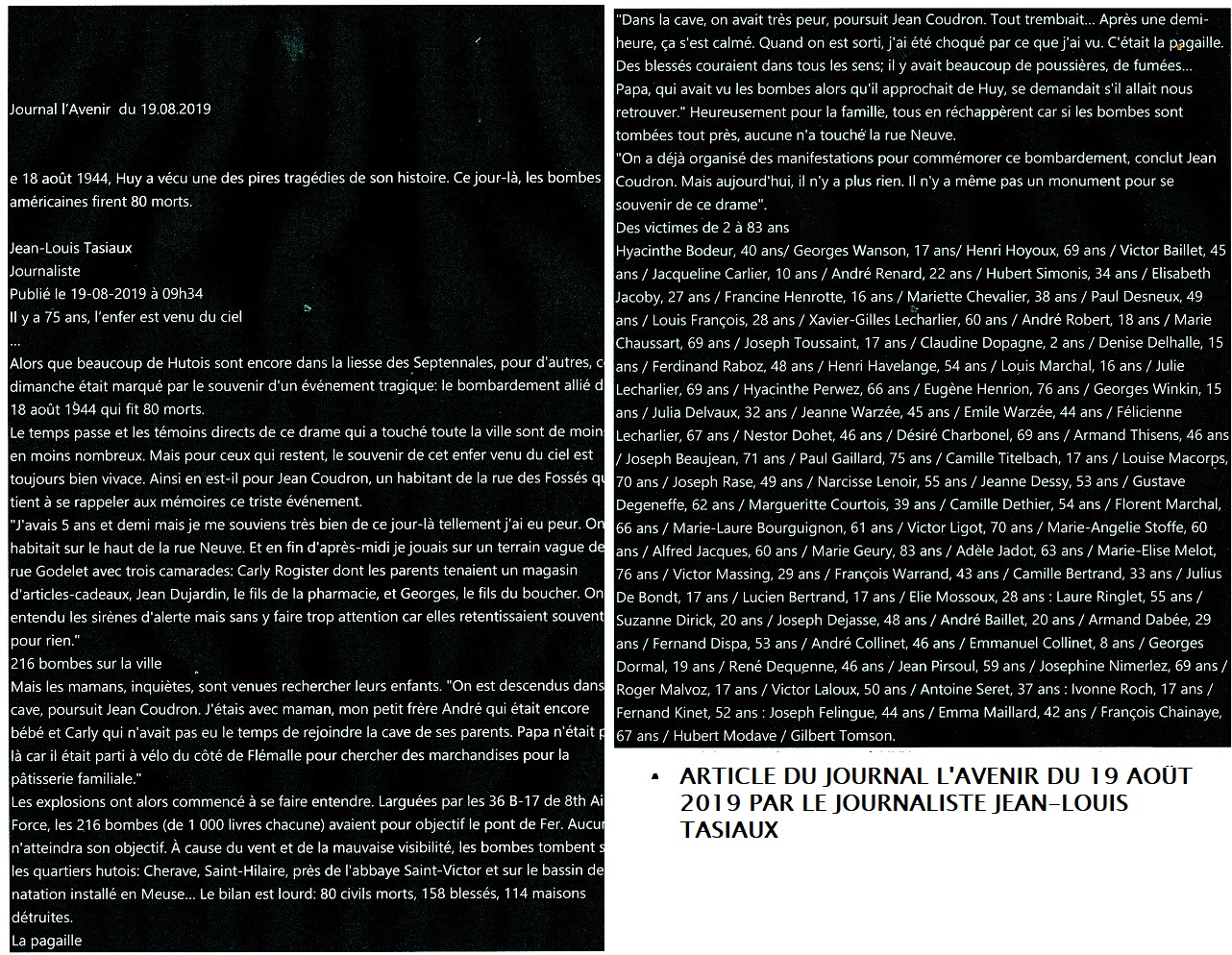 Bombardement sur Huy le 18 août 1944. Article du journaliste Jean-Louis Tasiaux de L'Avenir du 19 août 2019.