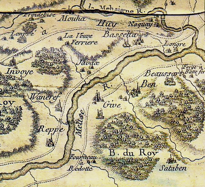 Carte du chevalier Beaurain, 1674, cartographe de Louis XIV. Camps de Hollogne et Neuville-sur-Mehaigne.