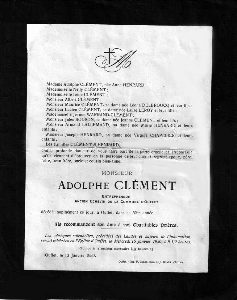 Ouffet, rue Sauvenière 10 Adolphe Clément faire-part de décès