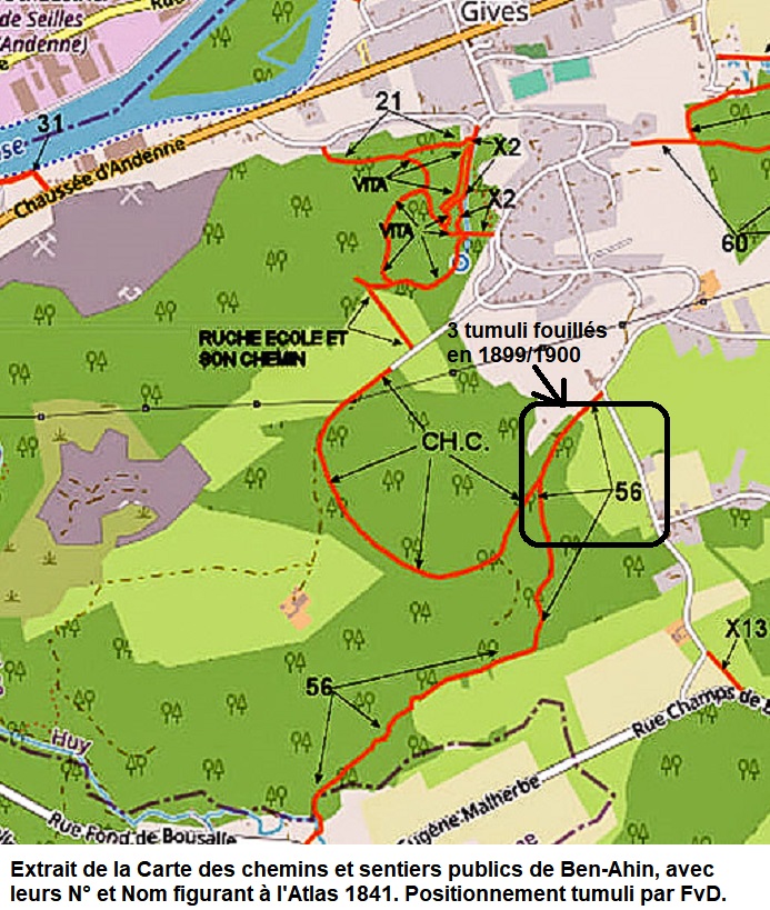 Carte de l'emplacement des 3 tumuli fouillés en 1900 à Gives.